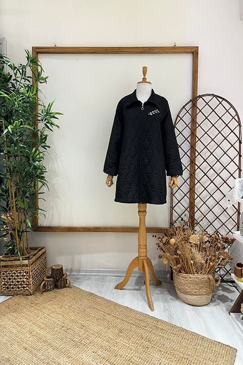 Kapitone kumaş Boy 84cm .Astarsız. Taş detaylı 2 cepli. boydan fermuarlı. Bilekleri lastikli